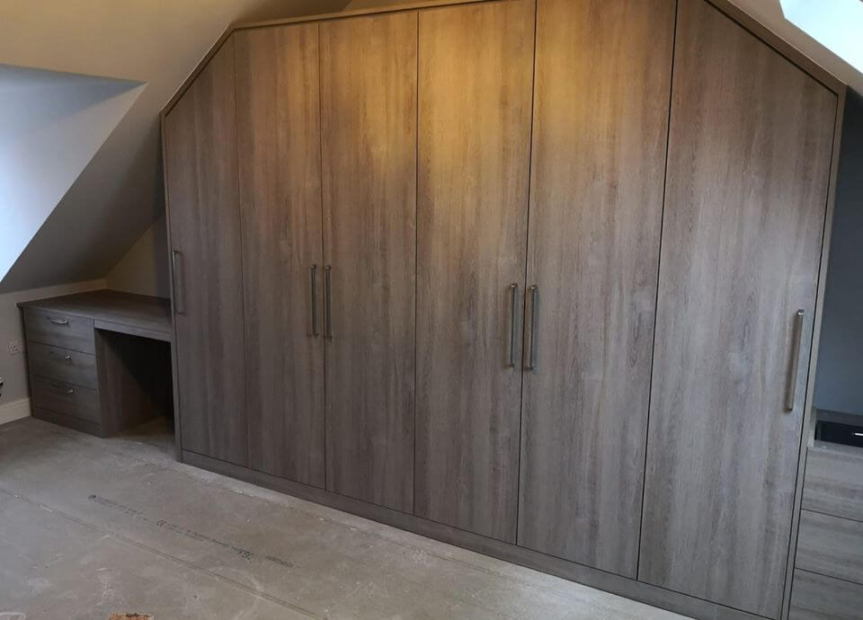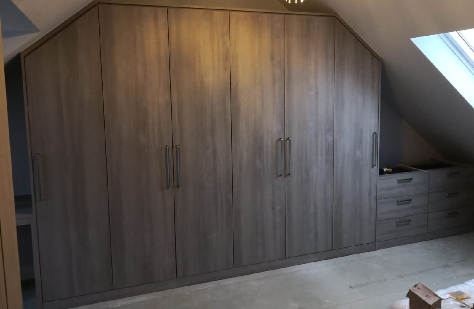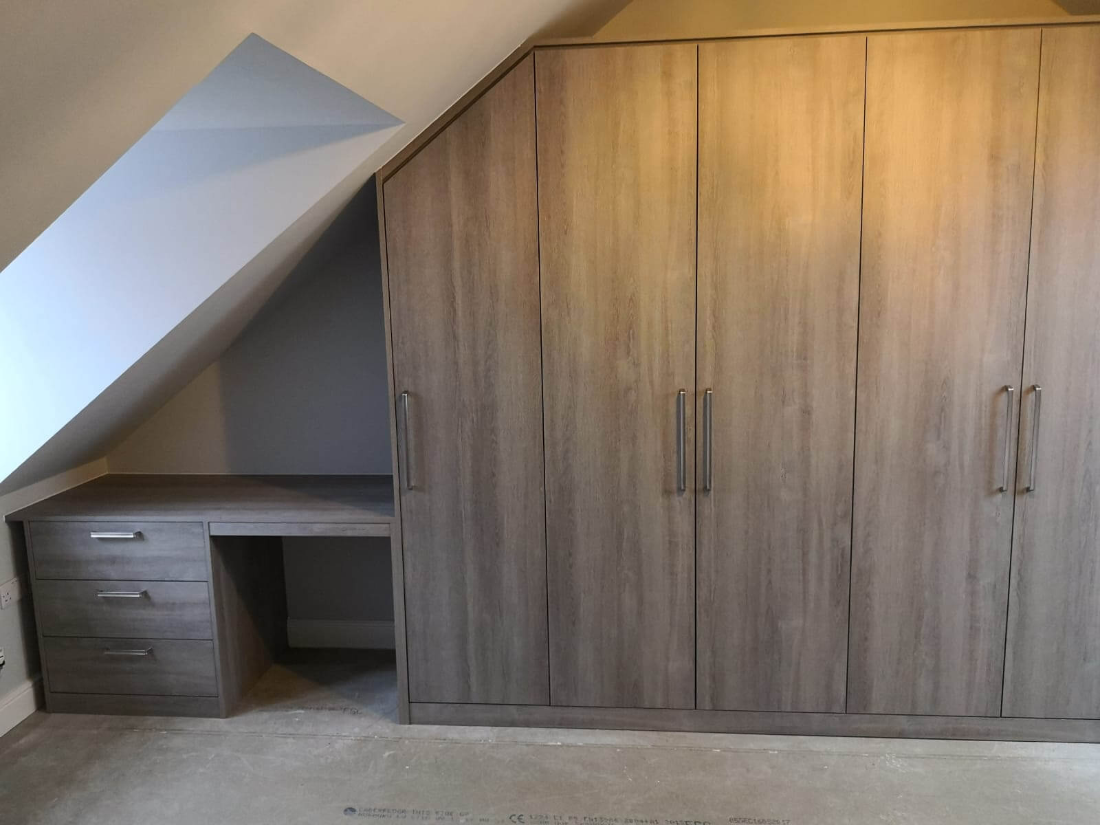 Through the use of slope wardrobes, we were able to design seamlessly fitted wardrobes against their sloped ceilings as well as the matching dressing table and chest. For us to be able to do this, we previously took precise measurements of the area of the installation and manufactured the furniture in our workshop. This allowed us to complete the full wardrobe installation in under 12 hours!